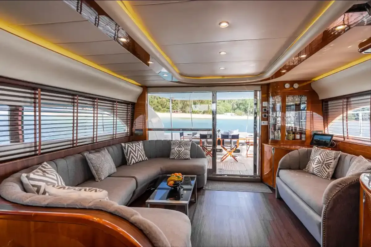 This magnificent 65ft flybridge Yacht for Charter at Krabi comes with huge outdoor areas for relaxing and sunbathing, as well as superior equipment & service level and a high degree of luxurious comfort.