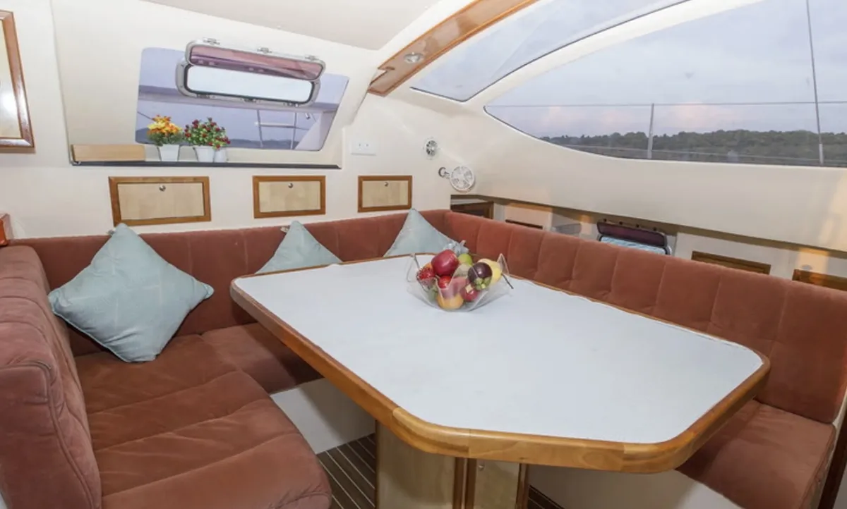 It has a large cockpit, plenty of seating in the shaded rear section and the typical relaxation area on the front trapezes. The saloon and galley allow for ample entertaining and cooking facilities. 2 air-conditioned cabins, 2 bathrooms.