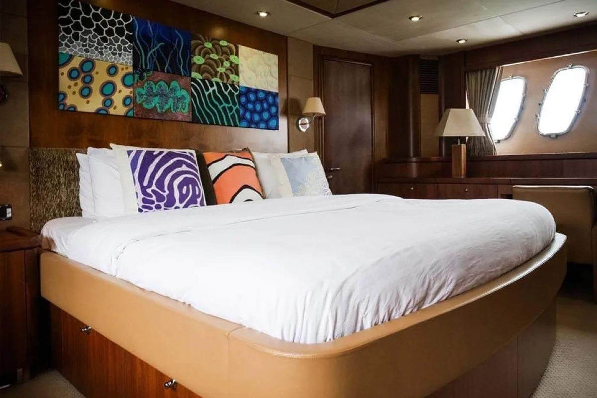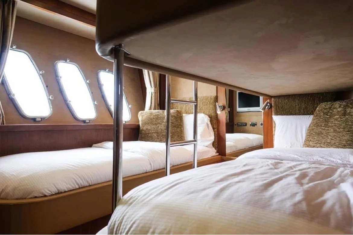Her impressive flybridge with a wet bar is ideal for entertaining with panoramic views. The generous deck features two separate dining areas, along with two large sun pads for relaxing. On the lower deck, 4 cabins await up to 8 guests overnight.