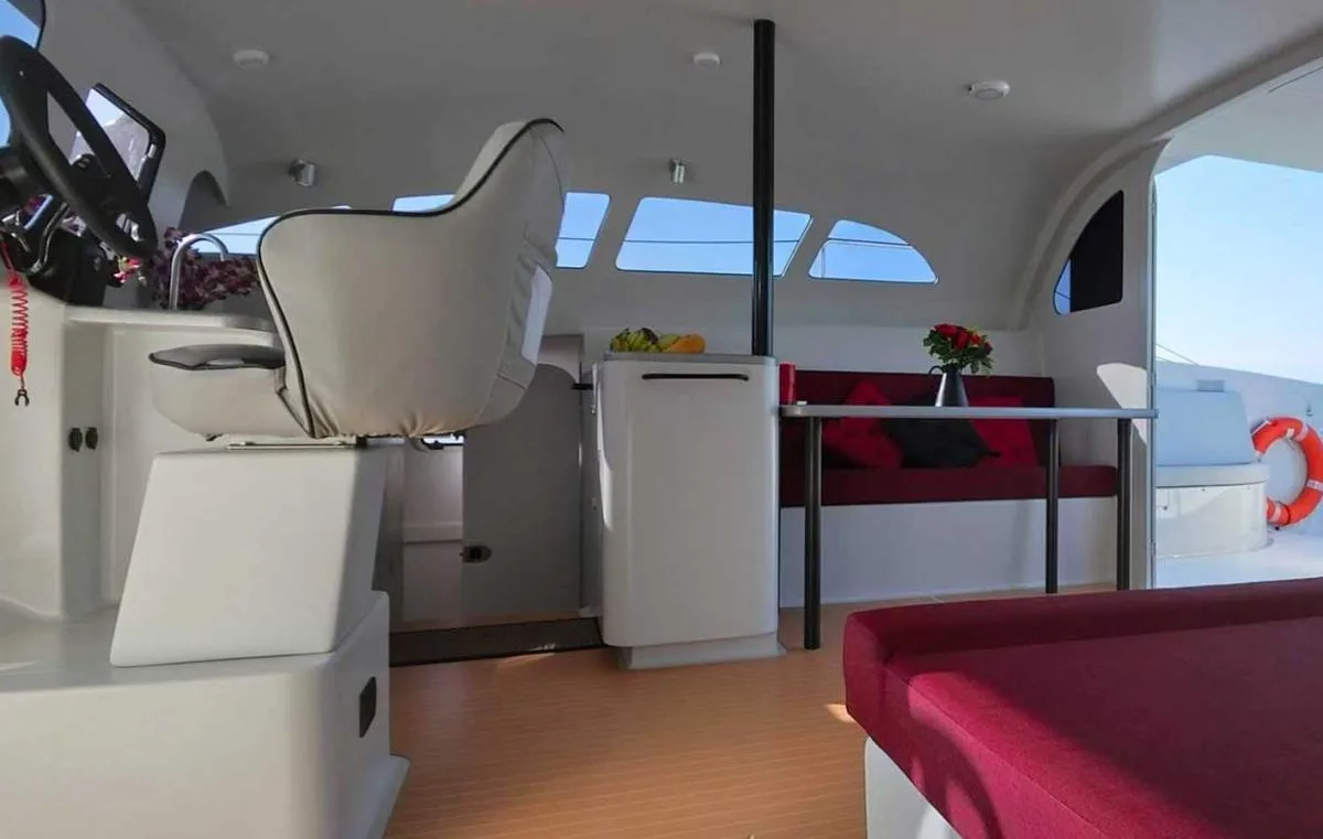 The power catamaran feels much larger than it is thanks to the smart, modern design of the large open-air saloon. It even offers a double cabin with bathroom, as well as a double sofa bed in the saloon if required.