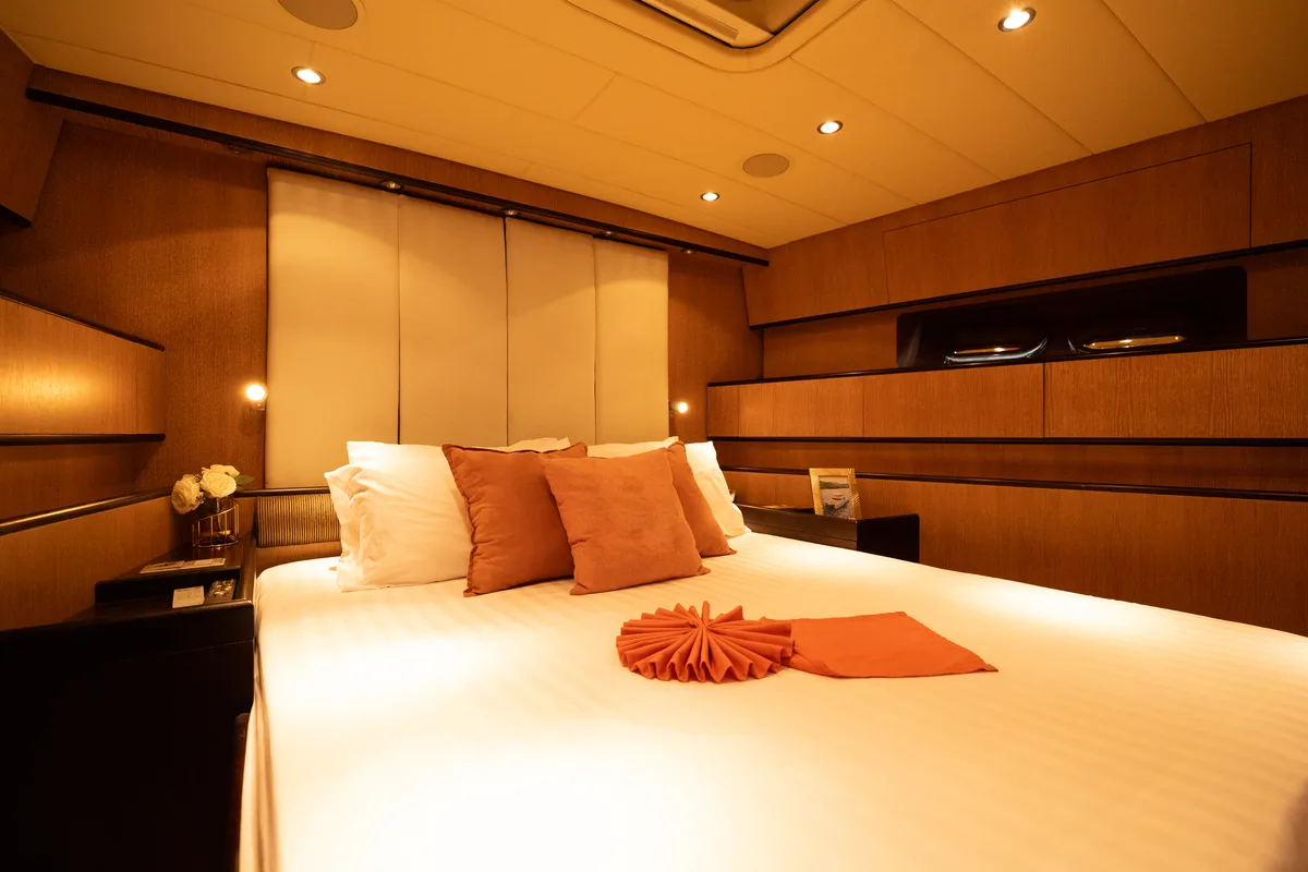 Below deck, the interior offers elegant accommodation for six guests across three beautifully appointed cabins, each with en-suite facilities. The full-beam master suite, located amidships, boasts exceptional volume and natural light, while a forward VIP cabin and a twin guest cabin provide additional comfort and privacy.