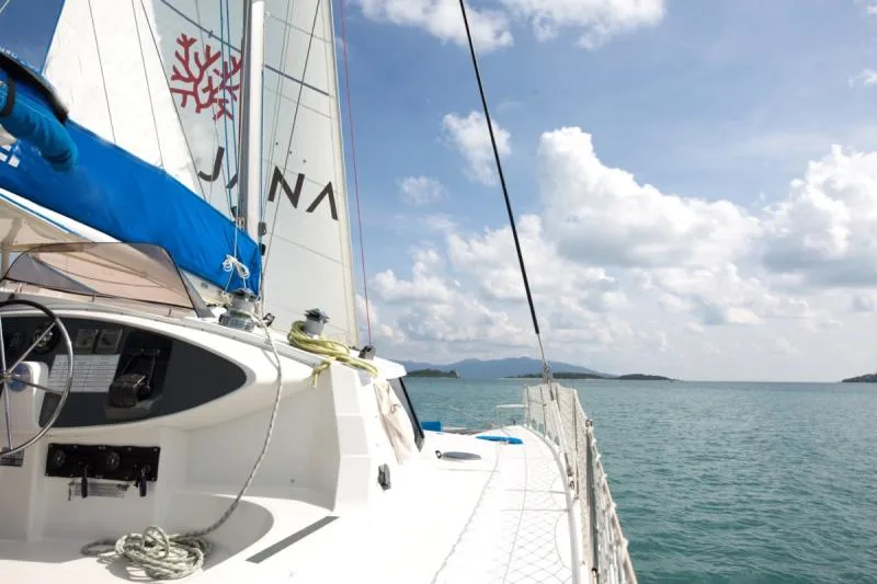 One of Samuis finest vessels: The Belize Catamaran of Fountain Pajot features 3 AC double cabins and a saloon like a luxury living room with 360 degree sea view. Best deal for private yacht charters!