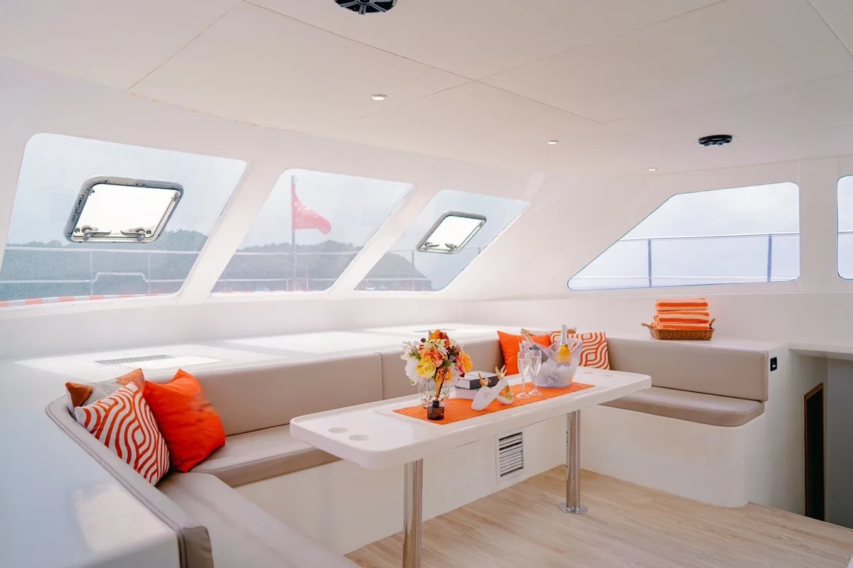 The Floeth 48 Power Catamaran is a spacious 48-foot vessel for budget charter in Phuket offering comfortable outdoor areas for relaxing and dining. With capacity for up to 40 guests, it's ideal for group celebrations and day trips.