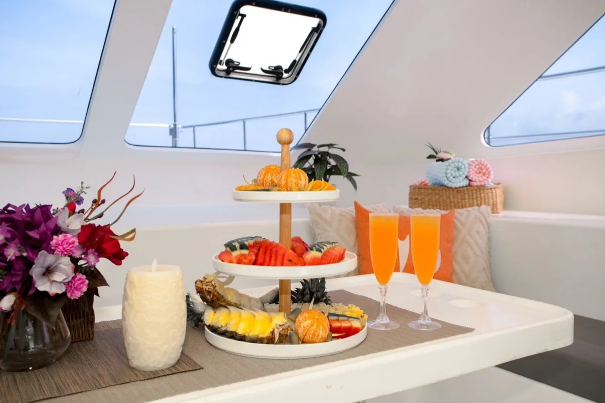 Sun-kissed mornings along the Andaman Sea can rival the glow of any diamond, particularly from your front-row seat aboard the lively Tequila. This 48ft power catamaran, a gem in the renowned Floeht Yachts fleet, comfortably accommodates up to 40 guests as you set off for a full day trip to the enchanting Khai Islands.