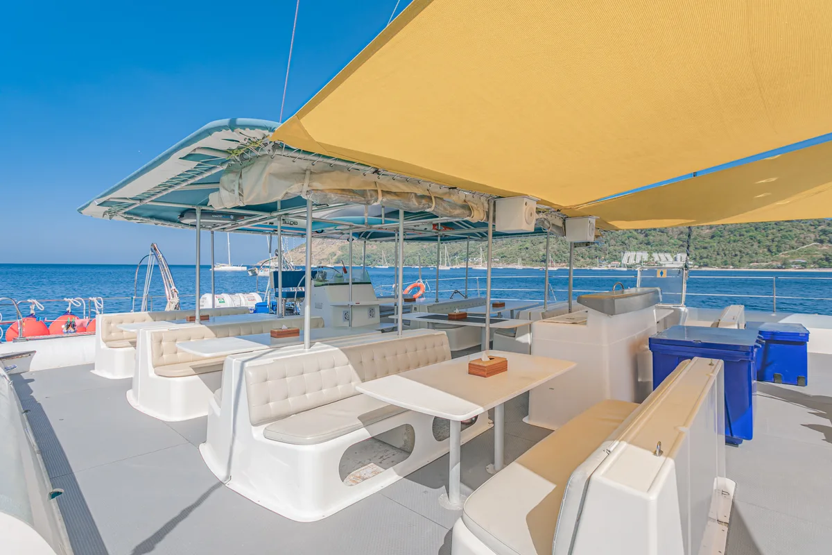 Onboard the magnificent Floating Beach, a spacious 75ft Tahiti, you’ll comfortably sail with up to 50 of your closest friends (or just your favorite people who won’t judge your tan lines). This large group boat is perfect for island hopping and soaking up the famous Thai hospitality. You can’t go wrong in Thailand when you have a crew ready to serve cocktails while you lounge in the sun!
