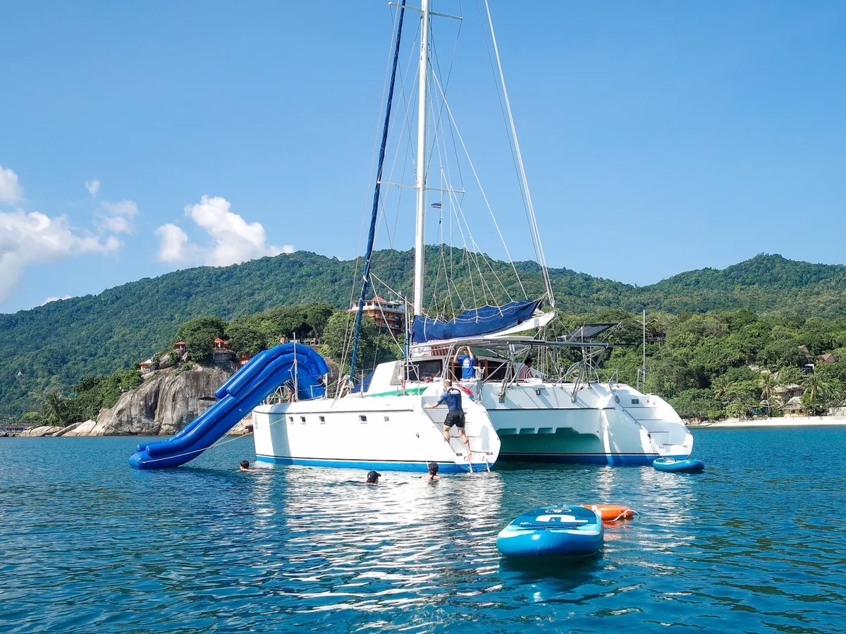 Meet Clare, our sleek 43-foot Privilege Catamaran – now available for exclusive private yacht charter in Samui: Perfect for sunset, half-day, or full-day cruises, this elegant yacht accommodates up to 20 guests in comfort and style.