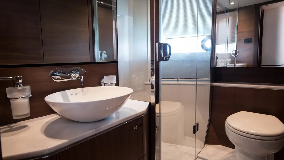 She represents the latest in advanced hull design that delivers outstanding sea-keeping and comfortable cruising. The beautifully appointed galley aft of the saloon, with an open-plan dining area opposite, has sliding doors and a fully opening electric window which leads out to the cockpit creating an alfresco bar.